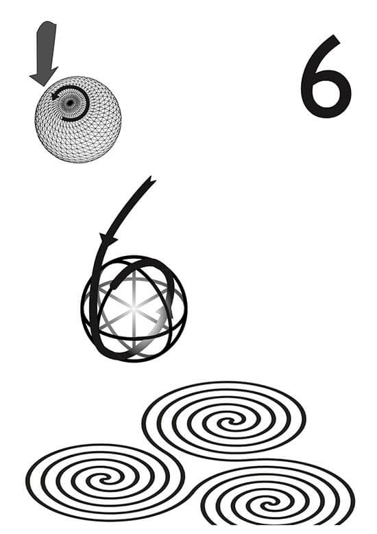 - La intención se enrosca en varias direcciones, parecido a el dos. La vida aprende que puede evolucionar en muchos sentidos. El seis se arremolinaba captando o aportando energías, y dota a la forma de innumerables posibilidades de manifestación.