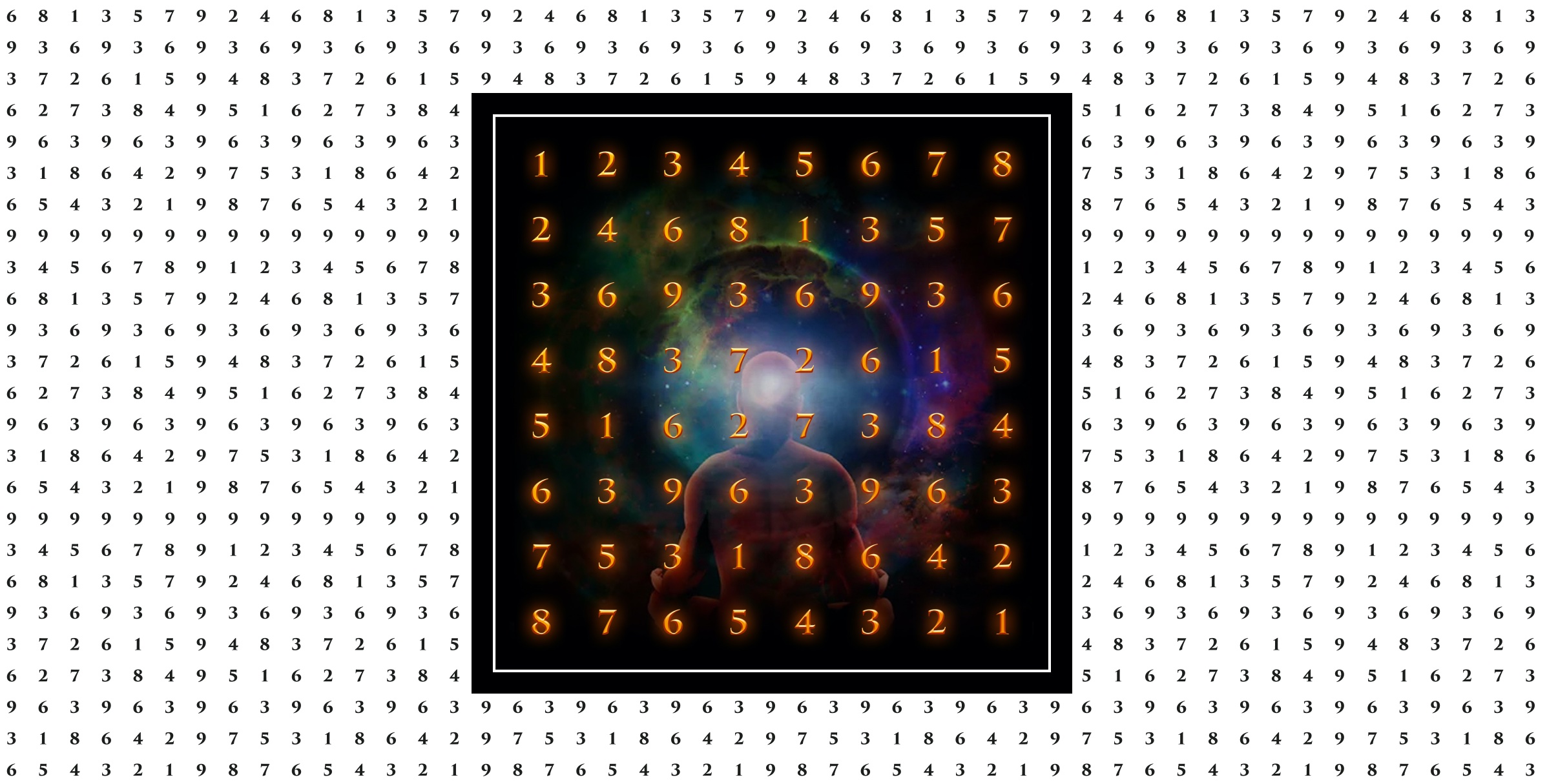 - El nueve está presente tanto en la simetría oculta como visible de la matriz. Hay nueve 9.